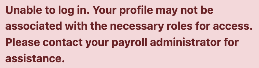 “Unable to log in. Your profile may not be associated with the necessary roles for access. Please contact your payroll administrator for assistance.”